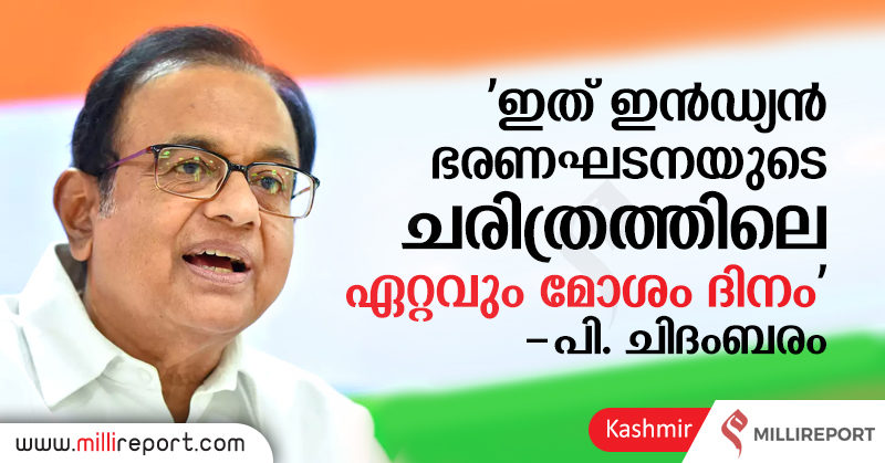 ന്യൂ ഡൽഹി: ഭരണഘടനയുടെ ആർട്ടിക്ക്ൾ 370 റദ്ദാക്കുകയും ജമ്മു കശ്മീർ സംസ്ഥാനത്തെ ഇല്ലാതാക്കി തൽസ്ഥാനത്ത് കേന്ദ്രഭരണ പ്രദേശം പ്രഖ്യാപിക്കുകയും ചെയ്ത കേന്ദ്ര സർക്കാർ നടപടിയുണ്ടായ ഇന്നത്തെ ദിവസം ഇൻഡ്യൻ ഭരണഘടനയുടെ ചരിത്രത്തിലെ ഏറ്റവും മോശം ദിനമാണെന്ന് മുൻ കേന്ദ്ര മന്ത്രിയും കോൺഗ്രസ് നേതാവുമായ പി. ചിദംബരം ചൂണ്ടിക്കാട്ടി. മാധ്യമപ്രവർത്തകരെ കണ്ട് സംസാരിക്കുകയായിരുന്നു അദ്ദേഹം. ഭരണഘടനയിൽ കൈവെച്ചുകൊണ്ടുള്ള ബി. ജെ. പി. ധാർഷ്ട്യം ജമ്മു കശ്മീരിന് അംഗഭംഗം വരുത്തിയിരിക്കുന്നു എന്നും ഏത് സംസ്ഥാനത്തോടും എപ്പോൾ വേണമെങ്കിലും ഇപ്പോഴത്തെ കേന്ദ്രം എന്തുവേണമെങ്കിലും ചെയ്യും എന്നാണിതിന് അർത്ഥം എന്നും ഇൻഡ്യ എന്ന ആശയം ആണ് മരിച്ചുകൊണ്ടിരിക്കുന്നത് എന്ന് മനസ്സിലാക്കി എല്ലാവരും ഒറ്റക്കെട്ടായി കശ്മീരിലെ ജനങ്ങൾക്കുനേരെയുള്ള ബി. ജെ. പി അക്രമത്തെ എതിർക്കണമെന്നും അദ്ദേഹം പറഞ്ഞു.