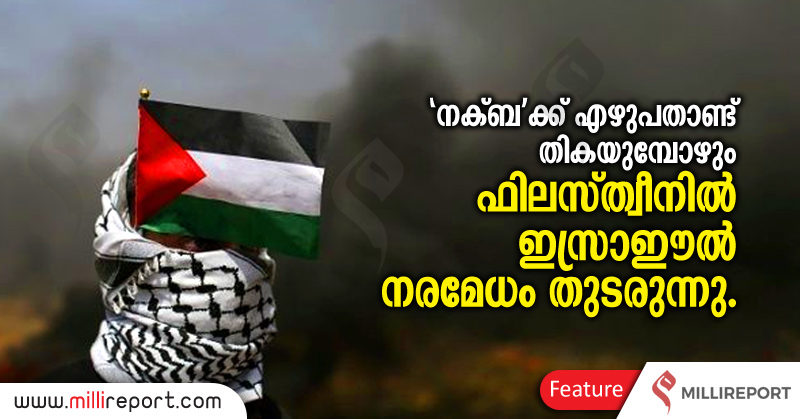 ‘അന്നക്ബ’ക്ക് ഏഴു പതിറ്റാണ്ട് പൂർത്തിയാവുകയാണ്. ഈ ഏഴുപത് വർഷവും ഫിലസ്ത്വീനിലെ പച്ച മനുഷ്യർ ഇസ്രാഈലിന്റെ ദ്രംഷ്ടകൾക്കുള്ളിൽ പിടഞ്ഞുപിടഞ്ഞ് നിലവിളിക്കുകയായിരുന്നു; ലോകത്തിന്റെ ബധിരകർണങ്ങളിലാണ് അത് മിക്കപ്പോഴും ചെന്ന് പതിച്ചതെങ്കിലും. മഹാമർദ്ദനത്തിന്റെ എഴുപതാം സംവത്സരം വിട പറയുമ്പോൾ ആസ്ഥാനം തെൽ അവീവിൽ നിന്ന് അറബികളുടെ ഹൃദയഭൂമിയായ ജറൂസലേമിലേക്ക് മാറ്റാനുള്ള തത്രപ്പാടുകളാണ് അമേരിക്കൻ പിന്തുണയോടെ ഇസ്രാഈൽ സ്റ്റെയ്റ്റ് റ്റെററിസത്തിന്റെ അടുക്കളയിൽ തകൃതിയായി നടക്കുന്നത്. അമേരിക്കൻ എംബസി ജറൂസലേമിലേക്ക് മാറ്റി സ്ഥാപിച്ചതിനെതിരെ പ്രതിഷേധിക്കാനെത്തിയ ഫിലസ്ത്വീനികളെ ഇന്നും ഇന്നലെയുമായി കൂട്ടക്കുരുതി നടത്തി ‘നക്ബ’യുടെ വാർഷികം ചോര കൊണ്ടുതന്നെ എഴുതുകയാണ് ഇസ്രാഈൽ എന്ന തെമ്മാടി രാജ്യം. നക്ബയുടെ എഴുപതാം വാർഷികത്തിൽ പിടഞ്ഞുവീണ ആ ഫിലസ്ത്വീനികൾ ഒരു ജനതയുടെ സമരവീര്യത്തെ കെടുത്തിക്കളയുമെന്ന ധാർഷ്ട്യം നിറഞ്ഞ ആത്മവിശ്വാസമാണ് ഇസ്രാഈൽ പല്ലിളിക്കുമ്പോൾ ദൃശ്യമാകുന്നത്. സുഊദി അറേബ്യ അടക്കമുള്ള പ്രമുഖ മുസ്ലിം രാജ്യങ്ങൾ ഇസ്രാഈലിന്റെ നിഷ്ഠൂരമായ നികൃഷ്ടതക്കെതിരിൽ ശക്തമായി രംഗത്തുവന്നിട്ടുണ്ട്. വിമോചനത്തിന്റെ പൊൻപുലരിക്കായി ക്വുദ്സിന്റെ മണ്ണ് ഇനിയെത്ര കാലം കാക്കേണ്ടി വരും!